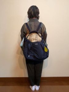 丁度、この大きめリュック(行きは通常必要品と服と靴と風呂敷だけですが、帰りは風呂敷に包んだ着物・帯・その他諸々&草履を入れねばならないので)、肩紐が長めで帯の下あたりにバッグが当る形になって良い具合。