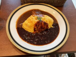 カレーとハヤシ半々にかかったオムライス