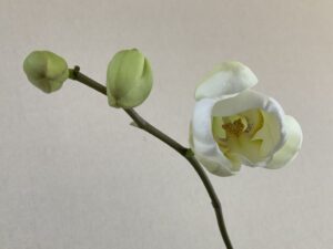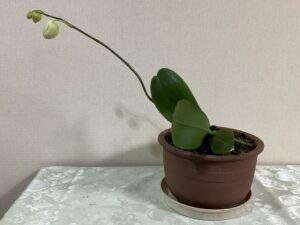 もう何~~~年も以前にどなたかから頂いた胡蝶蘭の鉢植え、枯れちゃったのかな?と思っていましたが、一株かろうじて生き残っていたようで、それが変な形に根を伸ばし、数年間葉だけ数枚広げていたと思ったら、いつの間にか茎がどんどん斜めに長く伸びて「君は一体何をしたいんだ?」という形となり、でもなんとなく鶴とかフラミンゴとか、首の長い鳥が飛び立とうとする時みたいな形だったので密に「飛翔」と名付けていたのですが…