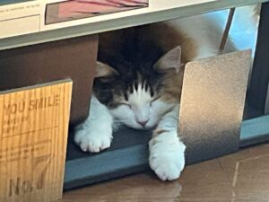 最近は、よくベッドにも乗っかって来るし、寝床用フワフワマットも敷いてあるというのに、この爪とぎ箱の中で寝ている事も…